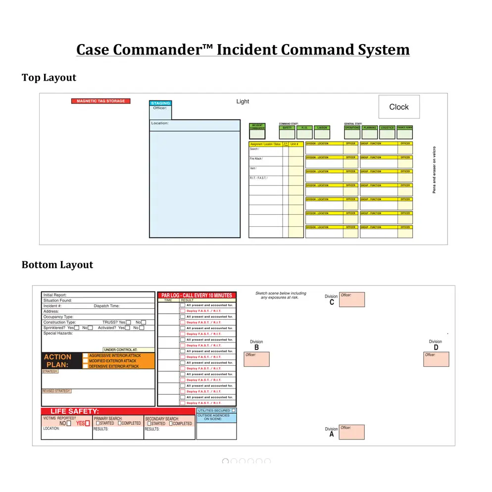 The Case Commander™ Command System will allow the I.C. to easily track assignments of personnel and apparatus through the use of the National Incident Management System. Large or small incidents can be managed with this system. Fill out your Command and General staff only as necessary.