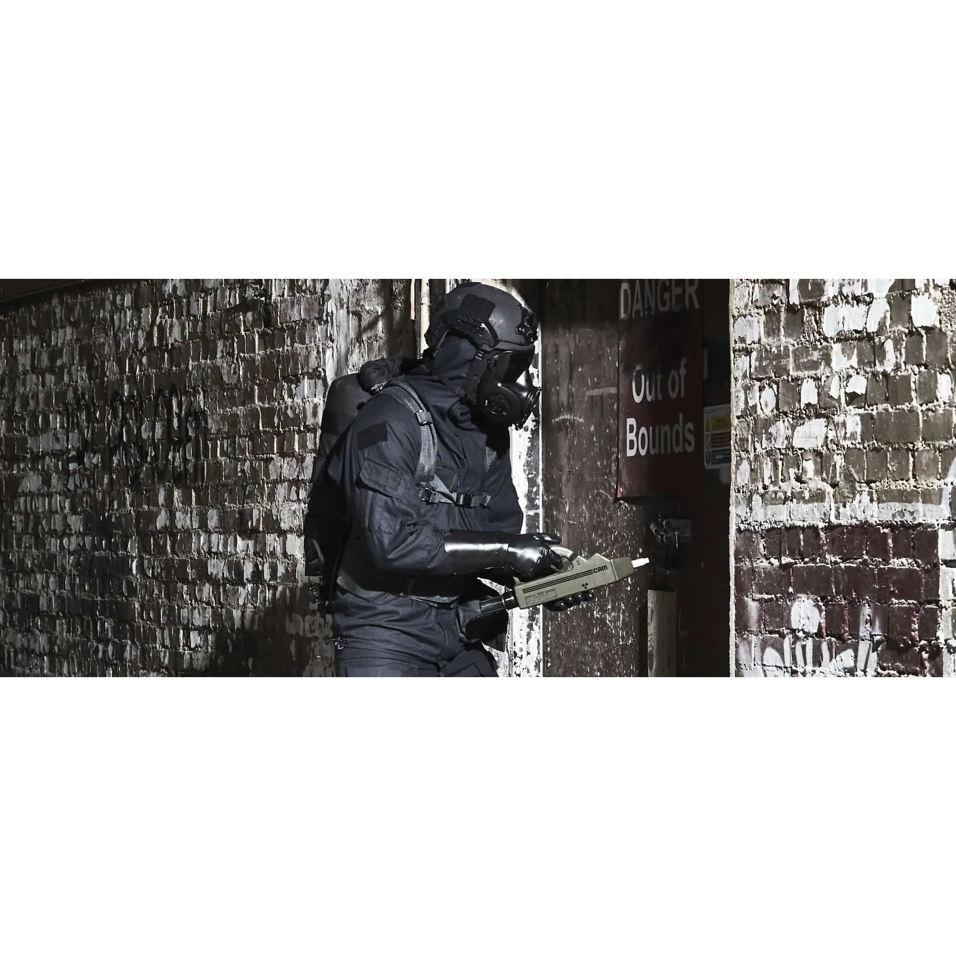 A switch between negative (filter) and positive (SCBA) pressure is achieved at the flick of a lever on the front of the mask. And by attaching a short or long duration compressed air cylinder, it is possible to enter a location on filter mode, assess the situation and change to SCBA mode if the need arises.
