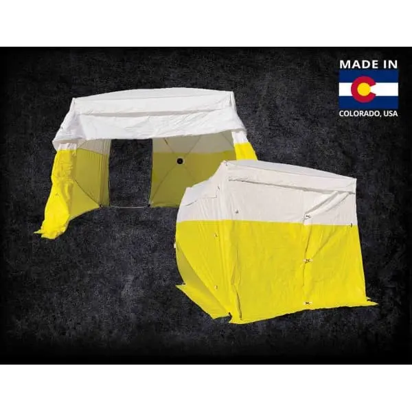 The Pelsue® Dual-Entry Series improves upon the Interlocking Series by adding a rear-access door for easy entry and exit when the front of the tent is closed off. This allows for greater access to work on a cabinet/box when two tents are connected together, or when the tent is attached to a work vehicle.