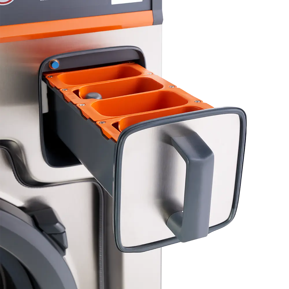 A wide-swing, large loading door and conical drum face make handling gear effortless. - Versatile Detergent Options