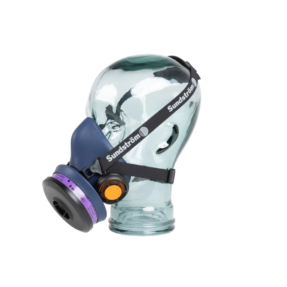 The Sundström® SR 100 half mask is an Air Purifying Respirator (APR) made of silicone in three sizes, i.e. S/M, M/L and L/XL. The mask is equipped with two exhalation valves, which ensures very low exhalation resistance. The valve covers with partitions effectively protect the exhalation membrane against dust and paint mist.